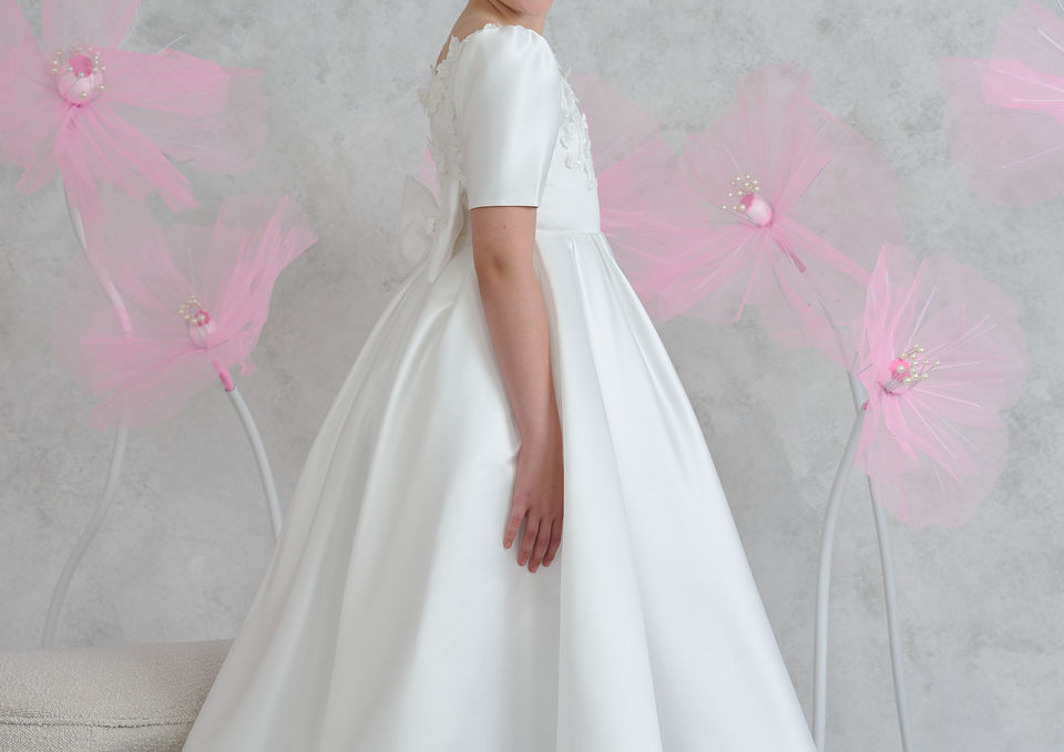 Communion Dress – Leann. Classic First Communion dress made of satin and lace with floral appliqué detail on the bodice. Short sleeves, round neckline, and a full A-line skirt finished with a large satin bow at the back. Handmade in Dublin for style, comfort, and a perfect fit.